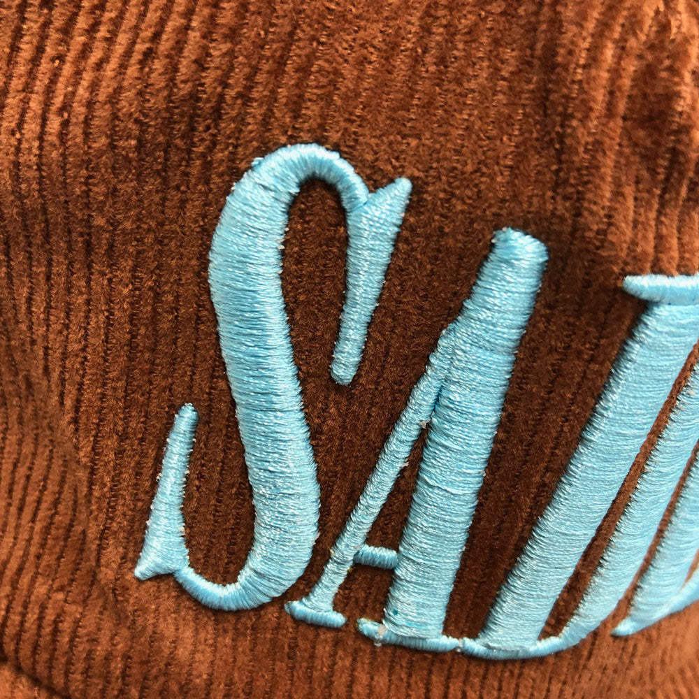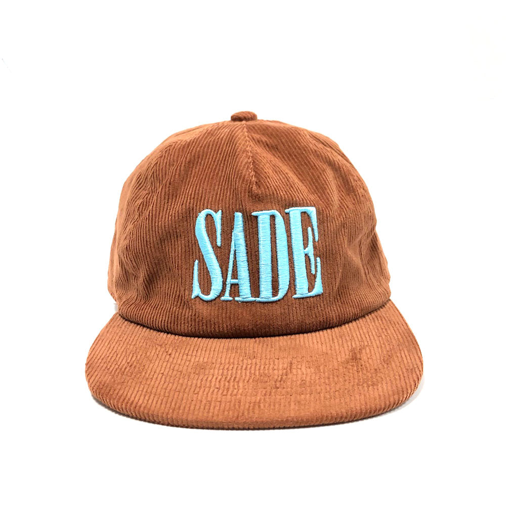 Inspired by the album diamond life.... We have here the musical group name SADE embroidered in a slick Ice Blue. The Puff or 3D embroidery is presented on a very comfy and low maintenance unstructured brown corduroy snapback hat!